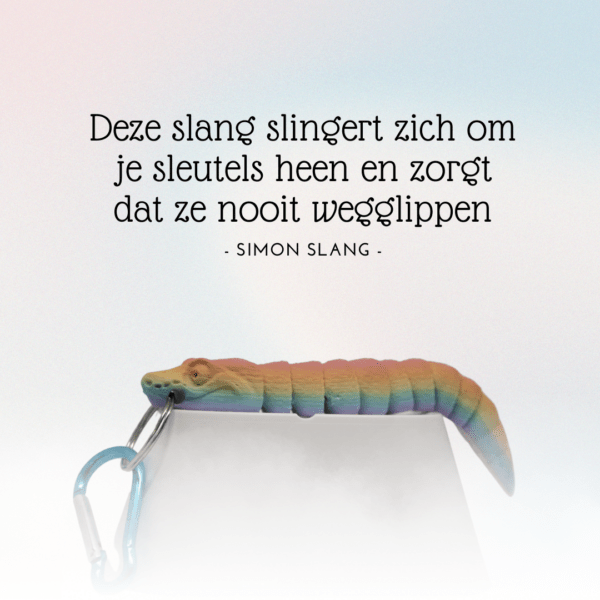 Bij gebruik van regenboogkleurig filament kan het exacte kleurverloop per sleutelhanger variƫren, wat elke Simon de Slang uniek maakt en een persoonlijk tintje toevoegt aan je sleutels!